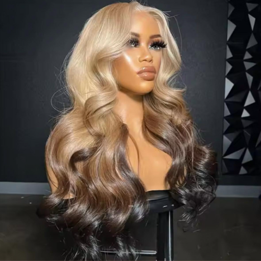 Human Hair Ombre Blonde Colored Frontal Wig for Women Transparent 13X6 Lace Front Human Hair Wig with Dark Root Pre Plucked